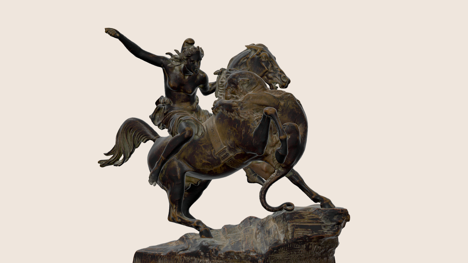 Diese Bronzeplastik einer mit einem Panther kämpfenden Amazone, der sich im Hals ihres Pferdes verbissen hat, war das Modell für die Monumentalplastik des oberschlesischen Bildhauers August Kiss (1802–1865), die 1842 vor dem Alten Museum in Berlin aufgestellt wurde.