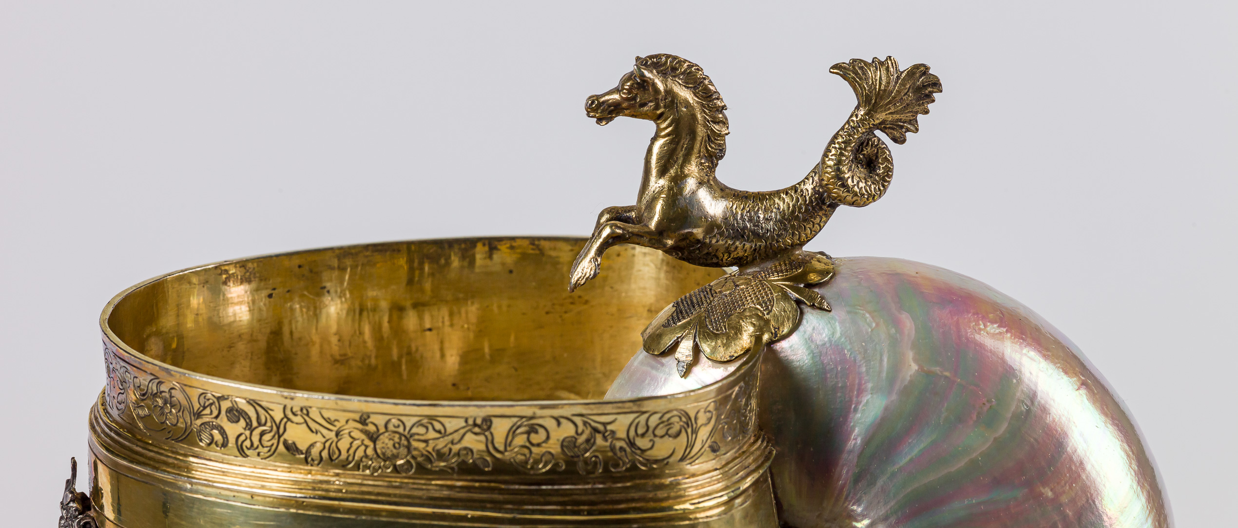 Muszlę żyjącego na zboczach tropikalnych raf koralowych łodzika wykorzystano na cenny, wykonany ze złoconego srebra puchar z konikiem morskim. Gospodarz, który w takim naczyniu serwował powitalny toast lub dekorował nim stół, uchodził za bogacza i ważną osobistość. To wyjątkowe naczynie na napoje jest dziełem mistrza złotnictwa Caspara Pfistera z Wrocławia.